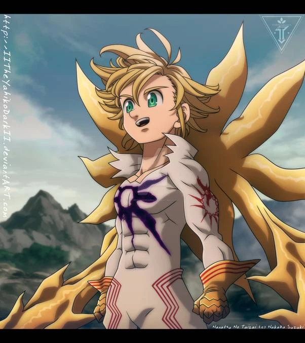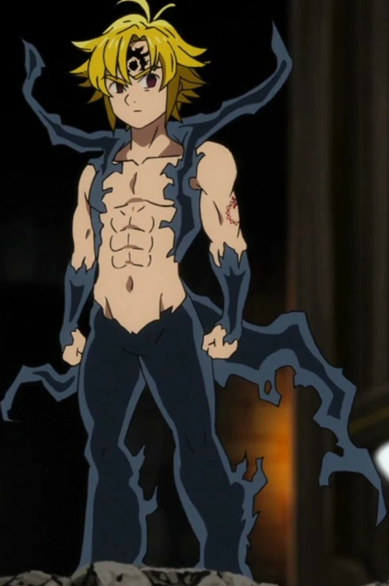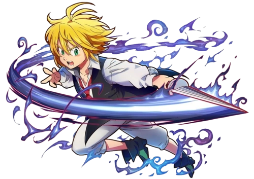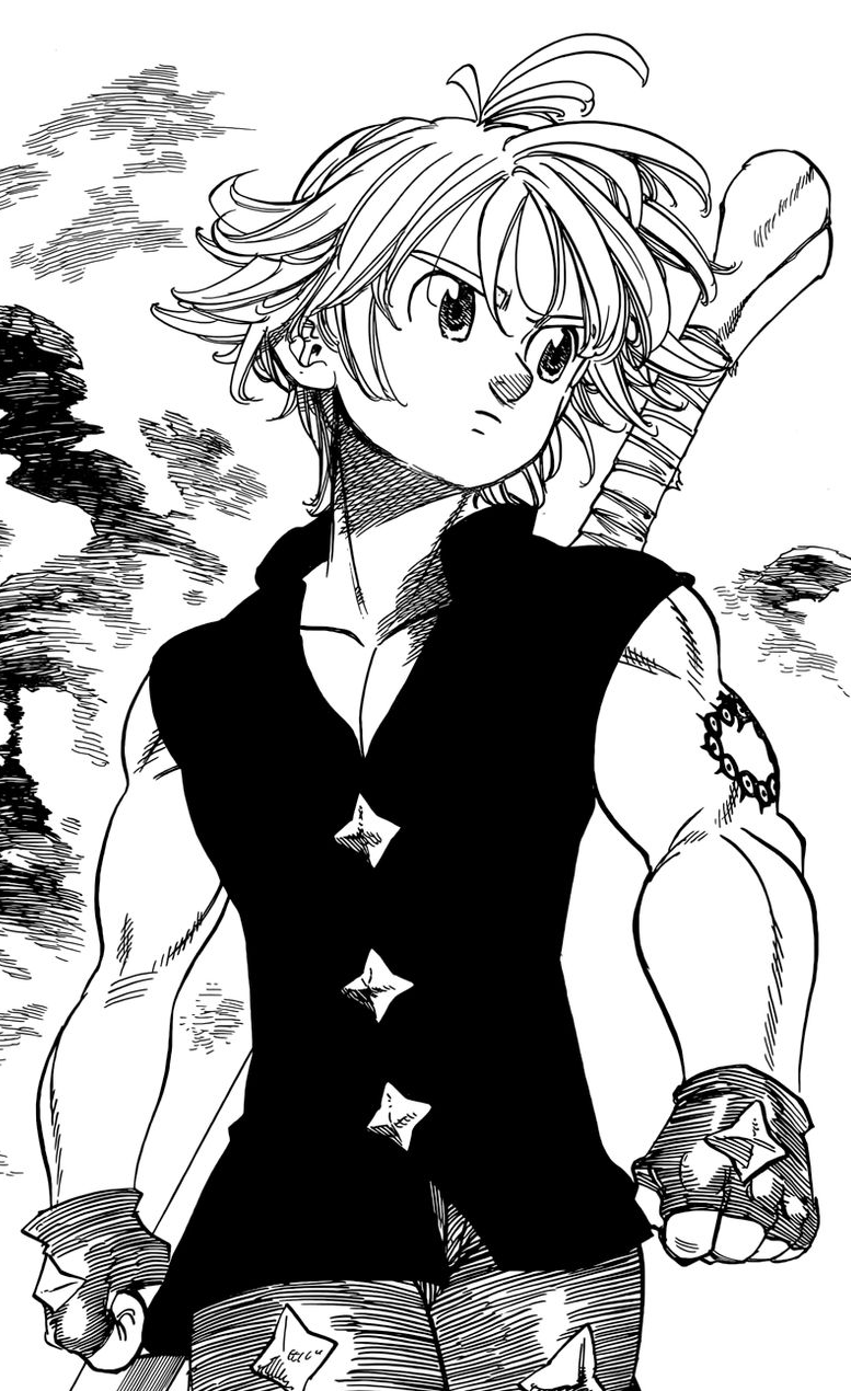 Meliodas「メリオダス」 est le Dragon de la Colère qui dirige les Seven deadly sins. Il est le principal protagoniste de la série, et était le propriétaire du célèbre Boar Hat, une taverne. Son Trésor Sacré est la Trancheuse de Démons Lostvayne et sa principale capacité est le Contre Total. Il est également l'ancien Chef des Dix Commandements, en tant que Meliodas de la Charité「慈愛のメリオダス Jiai no Meriodasu」, un ancien membre de l'Alliance Stigma, et le fils aîné du Roi des Démons.